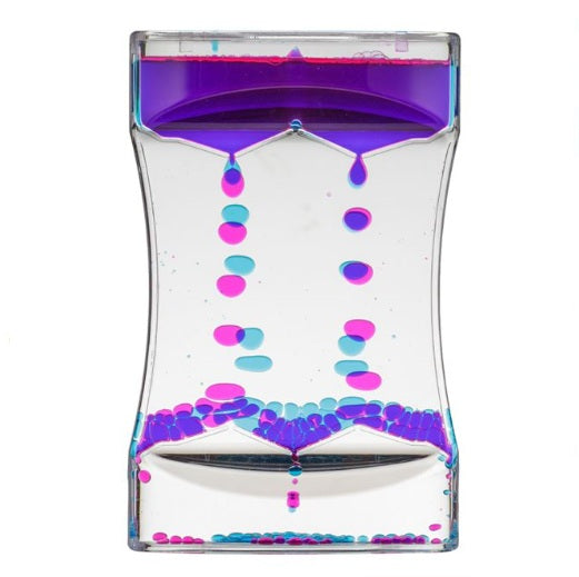 İçinde renkli sıvı bulunan şeffaf plastik kum saati; sıvı yavaş yavaş üçgen çizgiler halinde boşalarak renkli toplar oluşturuyor. Yeşil - kırmızı, fuşya - mavi veya mavi - yeşil.