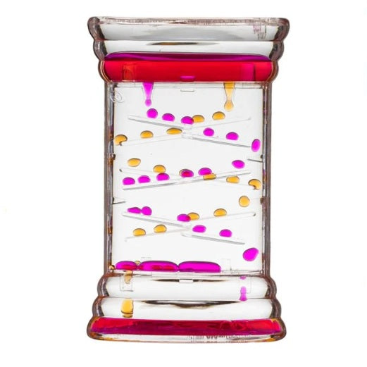 İçinde renkli sıvı bulunan şeffaf plastik kum saati; sıvı yavaş yavaş üçgen çizgiler halinde boşalarak renkli toplar oluşturuyor. Yeşil - kırmızı, fuşya - mavi veya mavi - yeşil.